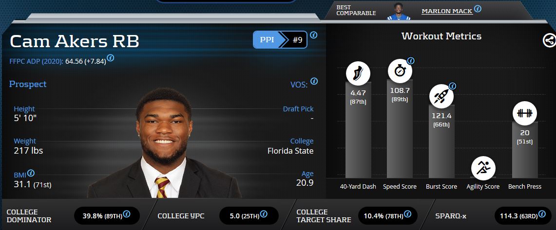 Cam Akers was taken at Pick 52 in Round 2 by the Los Angeles Rams and was the fourth running back off the board. He spent three years at Florida State University where he ran for 1,144 yards on 231 carries (5.0 yards per carry) and caught 30 passes for 225 yards with 18 total touchdowns during his last year in college.