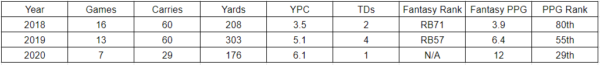 In Week 7, Drake went down with a severe ankle injury that could send him to the injured reserve. Drake will likely miss at least three games, forcing the Cardinals to turn to Edmonds as their starter. Given Drake’s poor 2020 efficiency, I’m not entirely confident that Drake wins the starting job back from Edmonds after this stretch. At the very least, I expect Edmonds to create a 50-50 split backfield instead of the carry split from the beginning of the season. Therefore, Edmonds should have borderline RB1 value as long as Drake sits and RB3 value when Drake returns.