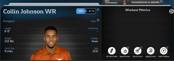 Collin Johnson was unable to test at the NFL Combine due to a hip-flexor injury. The Texas pro-day was also canceled due to concerns with COVID-19. Johnson’s size and the way he played on the field paint the picture of a physical, big-bodied wide receiver. He will need to use his massive size, catch radius, and ball-tracking ability to win against NFL corners.