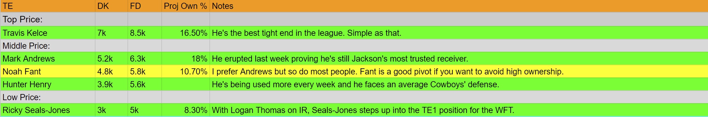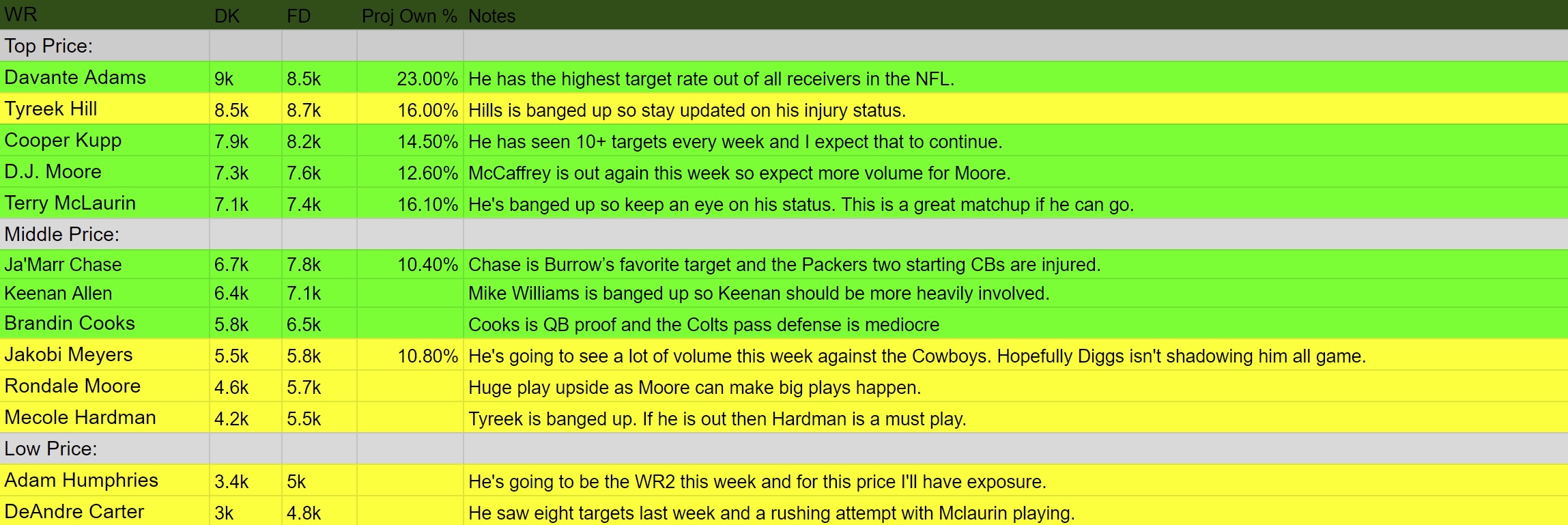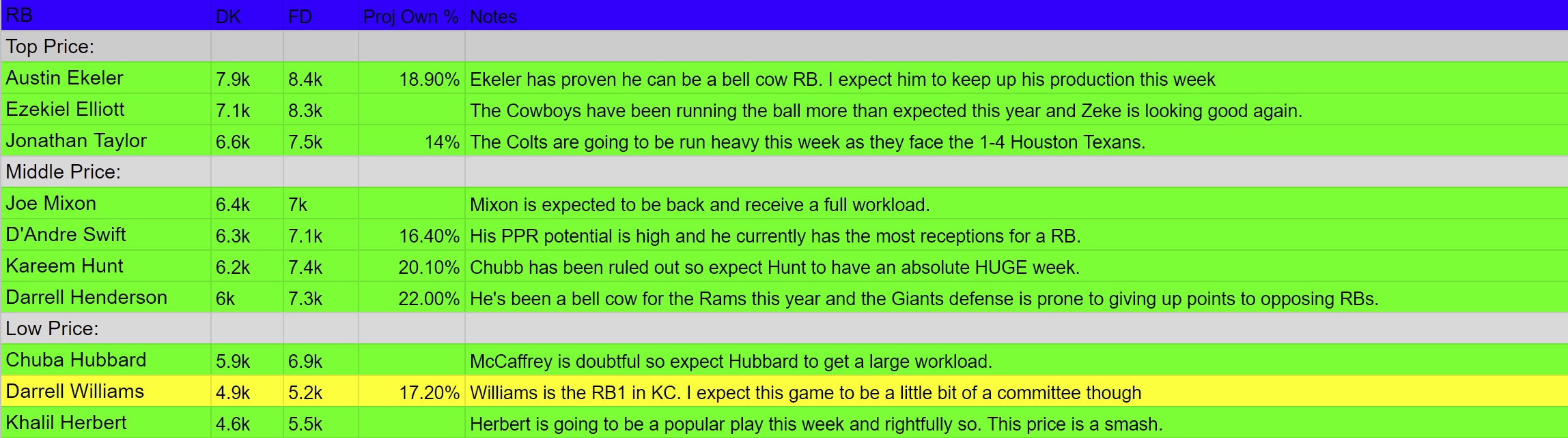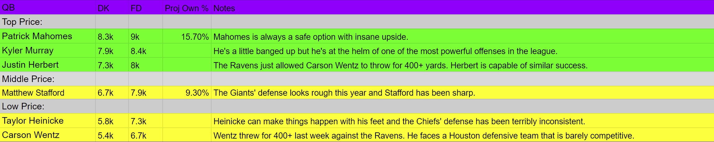Below I am going to highlight some of the best plays for this Sunday’s main slate. I have broken these plays down by position and by “Top Price”, “Middle Price”, and “Low Price”. Then, I list the players’ respective prices, projected points, and projected ownership in tournaments. Projected ownership is important to keep in mind for tournament plays as opposed to a regular cash play. In the “Notes,” I have given my thoughts about each player. I have also color-coded the quality level of each play. Green stands for a top-tier play, yellow is a middle-tier play, and red is a fade play. (I only note players predicted over 8% ownership.)