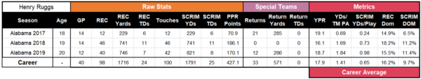 Henry Ruggs is 5’11” and 188 pounds. He played three years at Alabama and will be 21 years old at the beginning of the 2020 NFL Season. Ruggs, Alabama’s third all-time receiving touchdown leader, competed with other top receiving talents Jerry Jeudy, Calvin Ridley, Irv Smith Jr., Devonta Smith, and Jaylen Waddle while in Tuscaloosa.