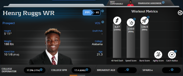 Henry Ruggs has a tantalizing amount of speed and quickness for a wide receiver. He was a big-play threat in college and his speed and quickness should help him create big plays and create yards after the catch in the NFL. His dynamism on special teams also adds a checkmark to his production profile. Ruggs’ production profile as a whole is slightly below average. His ability to consistently score touchdowns and his high yards per reception numbers really help bring his profile to a “slightly below-average level.” His market share numbers and lack of a breakout age hurt the case to make Ruggs the best wide receiver in this class. However, we truly never have seen a player like Henry Ruggs since 2000. Most prospects that don’t breakout have several seasons where they are non-factors. Ruggs, at 18 years old, immediately contributed among a highly competitive wide receiver group and consistently produced on offense. There is only a small sample size of eight or so wide receivers that fit these criteria. Within this cohort, Ruggs compares the closest to Marquise Goodwin and Travis Benjamin. However, the comps aren’t that close because Ruggs is a much better athlete than Benjamin and he’s a slightly better producer too. Meanwhile, Goodwin is comparable athletically, but Ruggs is a significantly better producer than Goodwin. Additionally, neither of these players has Henry Ruggs’ draft capital or level of competition for targets. He’s a type of prospect that we truly have never seen before from an athleticism/college production perspective. This makes Ruggs an unknown type of prospect with tremendous upside but with some risk as well.