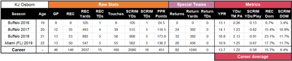 KJ Osborn broke out at the age of 21 (age during their first season with a 20% receiving dominator rating) in his third season and it was his best season for the Bulls. Osborn had 58 catches, for 908 receiving yards, and five scrimmage touchdowns for a receiving dominator rating (average percentage of their team’s receiving yards and receiving touchdowns) of 23.1% (24th percentile). Osborn had unremarkable age-adjusted production. He averaged 522.5 scrimmage yards (35th percentile) and 4.0 scrimmage touchdowns (34th percentile) per season for an average scrimmage dominator rating (average percentage of their team’s scrimmage yards and scrimmage touchdowns) per season of 9.4% (35th percentile). Osborn wasn’t overly efficient with the offense either and averaged 0.58 scrimmage yards per team play (34th percentile). Osborn contributed a lot on special teams as well. He had 82 returns, for 1,240 return yards, and zero return touchdowns.