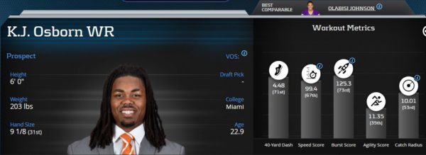 KJ Osborn is 6’0” and 203 pounds. He played three years at the University at Buffalo before transferring to Miami in 2019. He redshirted in his first year at Buffalo. He will be 23 years old at the beginning of the 2020 NFL season. Osborn only played one season in Miami. He transferred from Buffalo after the 2018 graduation class left too many voids in the depth chart for the team to be viable. In his lone season with the Hurricanes, he led them in receptions, receiving yards, and receiving touchdowns.