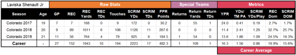 Laviska Shenault broke out at the age of 19 (age during their first season with a 20% receiving dominator rating) in his second season for the Buffaloes. Shenault’s best season was his sophomore season at 19 years old. Shenault had 89 catches, for 1,011 receiving yards, and 11 scrimmage touchdowns for a receiving dominator rating (average percentage of their team’s receiving yards and receiving touchdowns) of 32.7% (53rd percentile). Shenault had above-average age-adjusted production. He averaged 741.0 scrimmage yards (65th percentile) and 5.7 scrimmage touchdowns (60th percentile) per season for an average scrimmage dominator rating (average percentage of their team’s scrimmage yards and scrimmage touchdowns) per season of 15.6% (74th percentile). Shenault was very efficient from a yards per reception and yards per team play standpoint. He averaged16.3 yards per reception (76th percentile) and 0.86 scrimmage yards per team play (67th percentile). While Shenault wasn’t a contributor on special teams, he did have two big plays on special teams in his only opportunities. Both plays went over 50 yards and one resulted in a touchdown. Shenault appears to just ooze big-play ability.