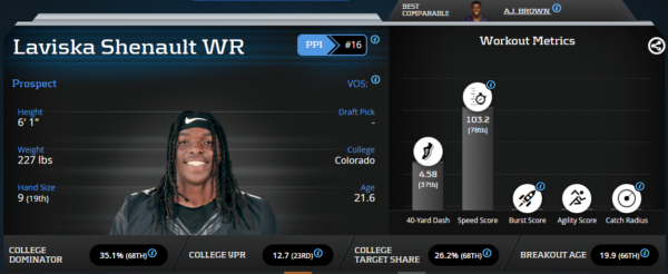 Laviska Shenault was dealing with an injury during the Combine and it seemed to affect his 40-yard dash time. With the injury, he has an excellent height-adjusted speed score of 103.2 (78th percentile) after running a 4.58-second 40-time. He did not participate in any other drills. Shenault is a bigger wide receiver that made electric plays consistently at Colorado. His speed and size combination paired with his running back playstyle should make him fun to watch in the NFL.
