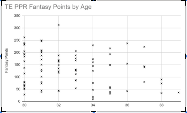 Looking at the individual players’ situation and what their teams decided to do with them is more predictive than age. The drop-off typically came when their team had a younger player break-out or changed their scheme and asked the older TE to do more blocking. In some cases, the drop-off never really came until they left the team.