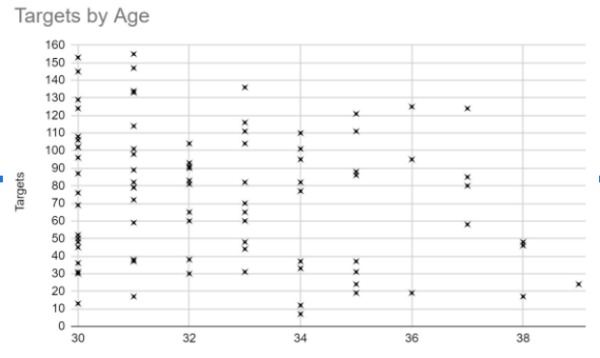 While the connection between targets and points is clear, the connection between targets and age is less obvious. While there does seem to be a trend between age and targets, it isn’t causative, meaning one doesn’t directly affect the other. Age has nothing to do with the number of targets a player is getting as made obvious by three of the four players at age 37 receiving 79 or more targets.