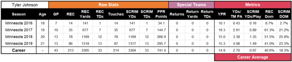 Tyler Johnson broke out at the age of 19 (age during their first season with a 20% receiving dominator rating) in his second season at Minnesota. It’s difficult to determine which season was Johnson’s best season in college. He had three consecutive seasons with a receiving dominator rating (average percentage of their team’s receiving yards and receiving touchdowns) over 40%. In each of his final two seasons, Johnson had over 75 receptions, 1,150 receiving yards, and 12 touchdowns. Johnson had outstanding age-adjusted production. He averaged 826.0 scrimmage yards (74th percentile) and 8.3 scrimmage touchdowns (85th percentile) per season for an average scrimmage dominator rating (average percentage of their team’s scrimmage yards and scrimmage touchdowns) per season of 18.3% (84th percentile). Johnson was very efficient as well and averaged 0.97 scrimmage yards per team play (78th percentile).