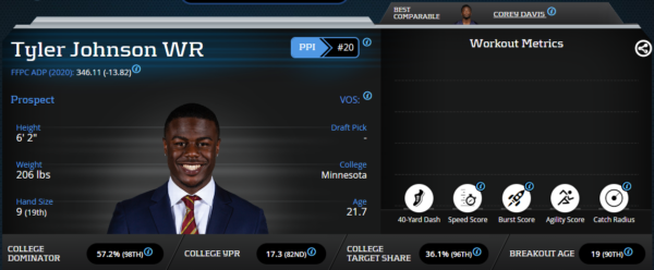 Tyler Johnson did not participate in the athletic testing at the NFL Combine. Minnesota’s pro day was canceled due to COVID-19 concerns. It’s difficult to decipher Johnson’s athleticism without athletic testing. However, Johnson is a very well balanced receiver who does many things well on the football field. He excels in contested catch situations and is very good in the redzone. There are rumblings among scouts that he lacks NFL level athleticism, but his dominance at Minnesota suggests otherwise.